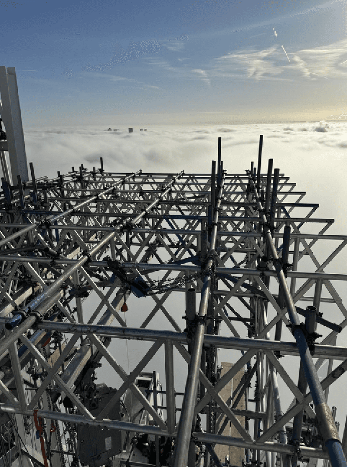 Logistics posed significant challenges. The lifts available were passenger-sized, limiting material lengths to 7ft and necessitating spliced scaffold joints, increasing risk and the need for tethering. Bespoke trolleys were designed and fabricated to move materials efficiently through the restricted lift routes. All deliveries were scheduled at night when the building was least occupied, with materials transported through viewing galleries and a complex sequence of lifts and staircases - from the loading bay to Level B3, then Level 33, Level 67, Level 78, and finally up the stairs to Level 87.